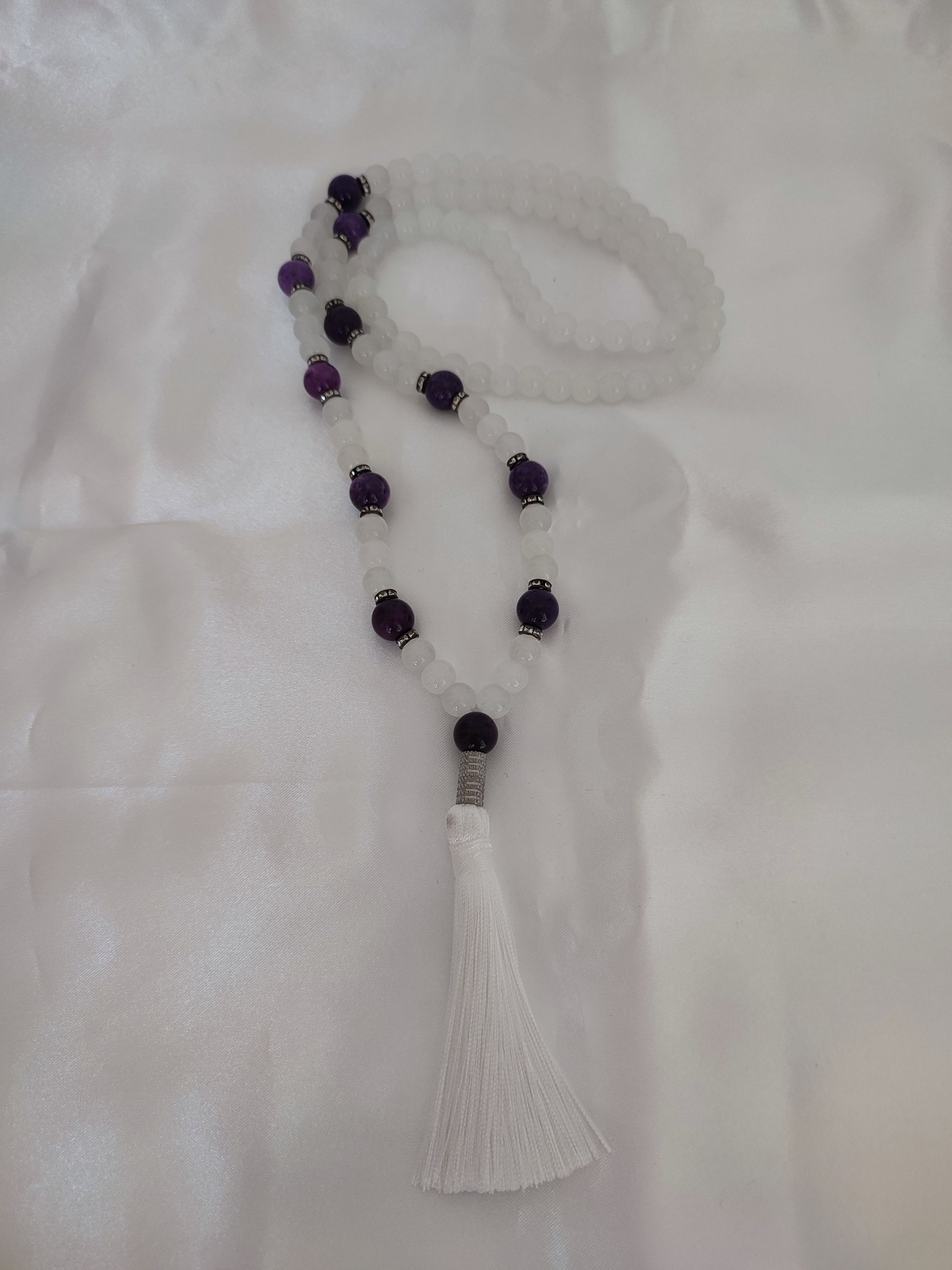 Japamala de 108 contas feita de quartzo branco e ametista, aqui estão alguns pontos que podemos destacar: