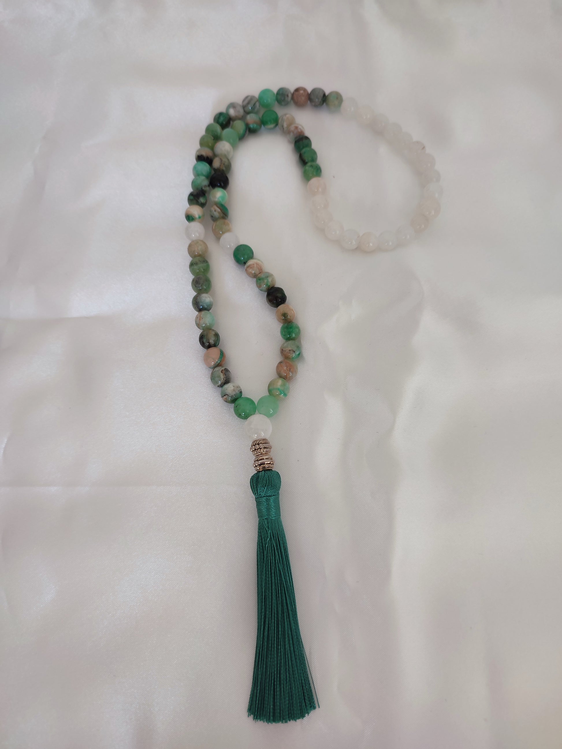 Esta japamala de 72 contas une a suavidade da angelite, pedra que promove a comunicação espiritual, a paz interior e a elevação da consciência, com a força da ágata branca, que traz proteção, equilíbrio emocional e purificação energética.