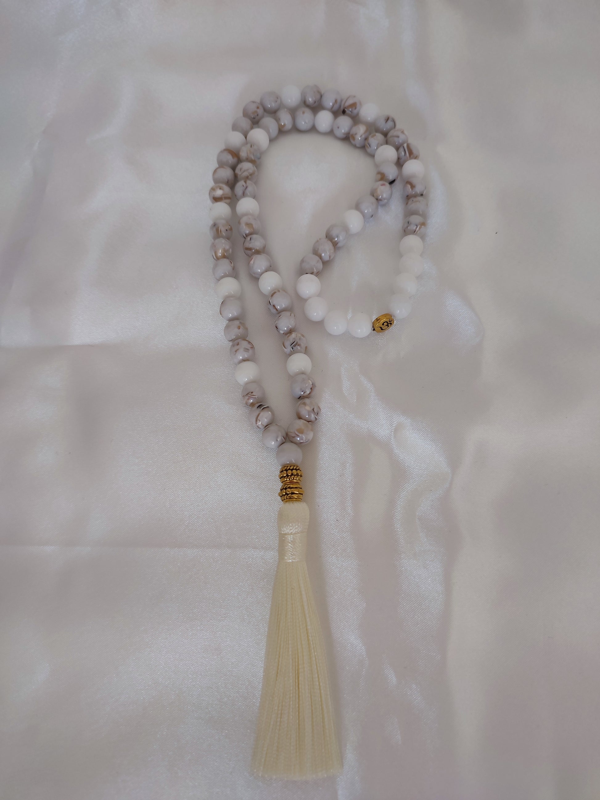 Japamala na pedra Howlite e Jade Malaysia Branca