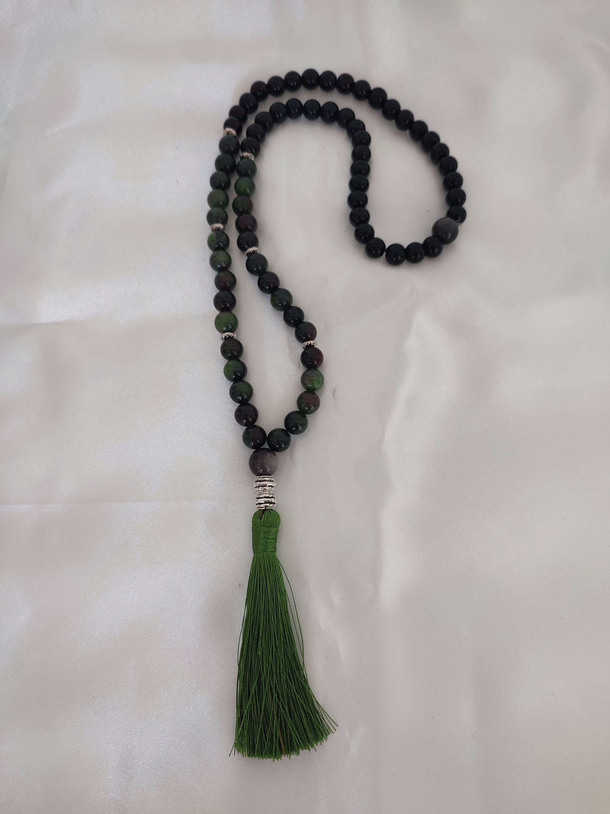Esta japamala de 72 contas une o poder de cura do Jaspe Verde com a proteção energética da Obsidiana Preta. O Jaspe Verde é uma pedra ligada à regeneração, ao equilíbrio emocional e à conexão com a natureza, promovendo bem-estar e serenidade. A Obsidiana é altamente protetora, ajudando a afastar energias negativas, cortar laços tóxicos e fortalecer o campo energético.