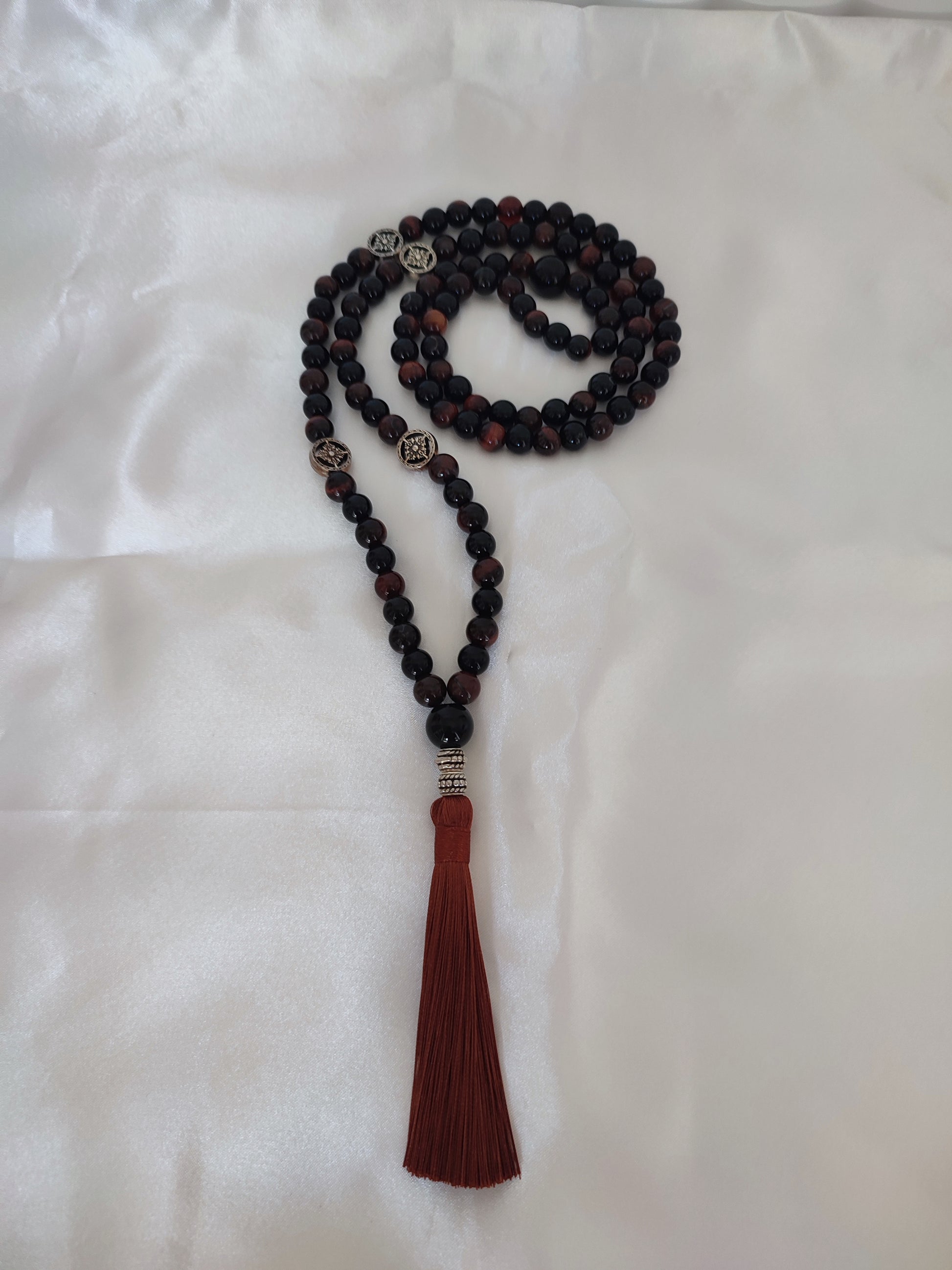 Japamala de 108 contas com Obsidiana Preta e Olho de Tigre Vermelho