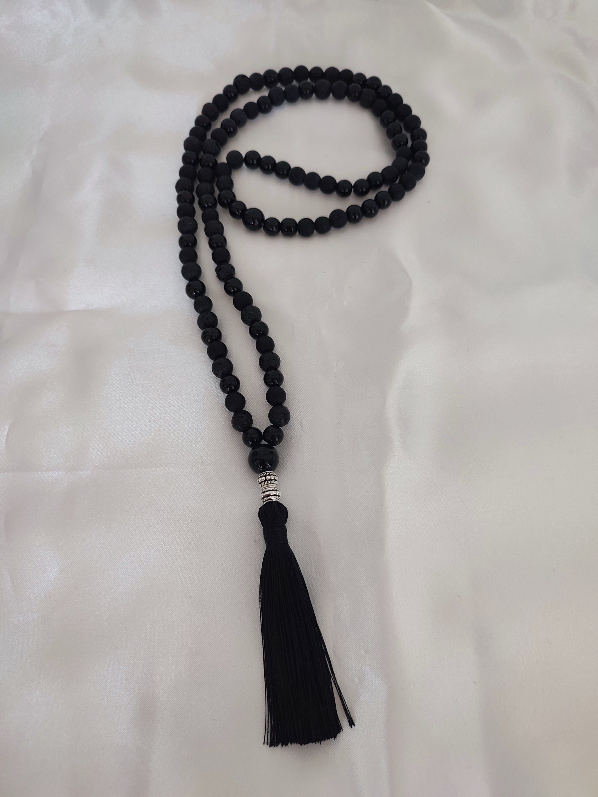 Esta Japamala de 108 contas foi cuidadosamente elaborada com ónix, ágata negra polida e pedra vulcânica, criando uma poderosa combinação para quem procura proteção energética, força interior e enraizamento espiritual.