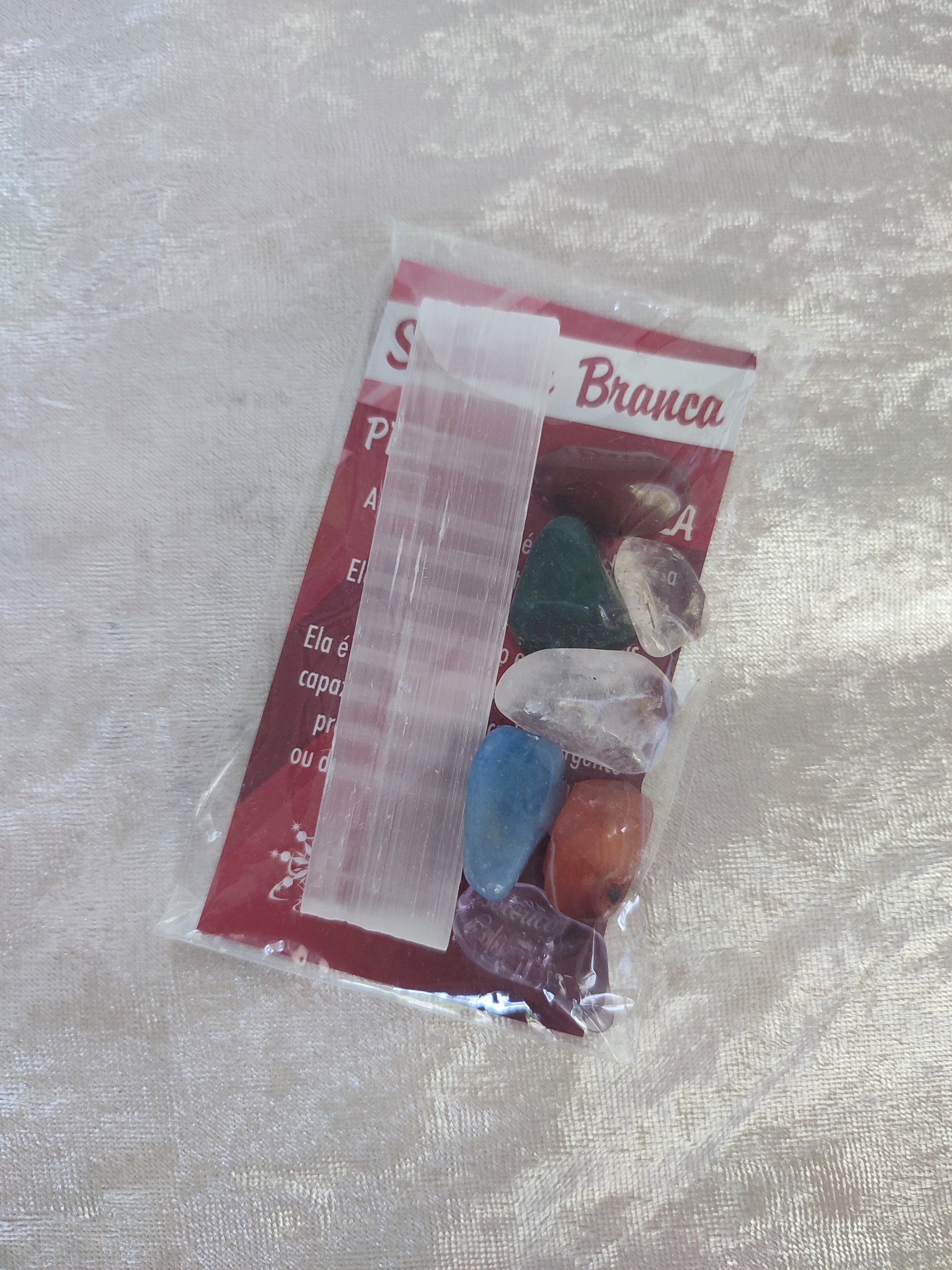 Kit de alinhamento dos 7 chakras principais, inclui uma barra de selenita para limpeza dos cristais.