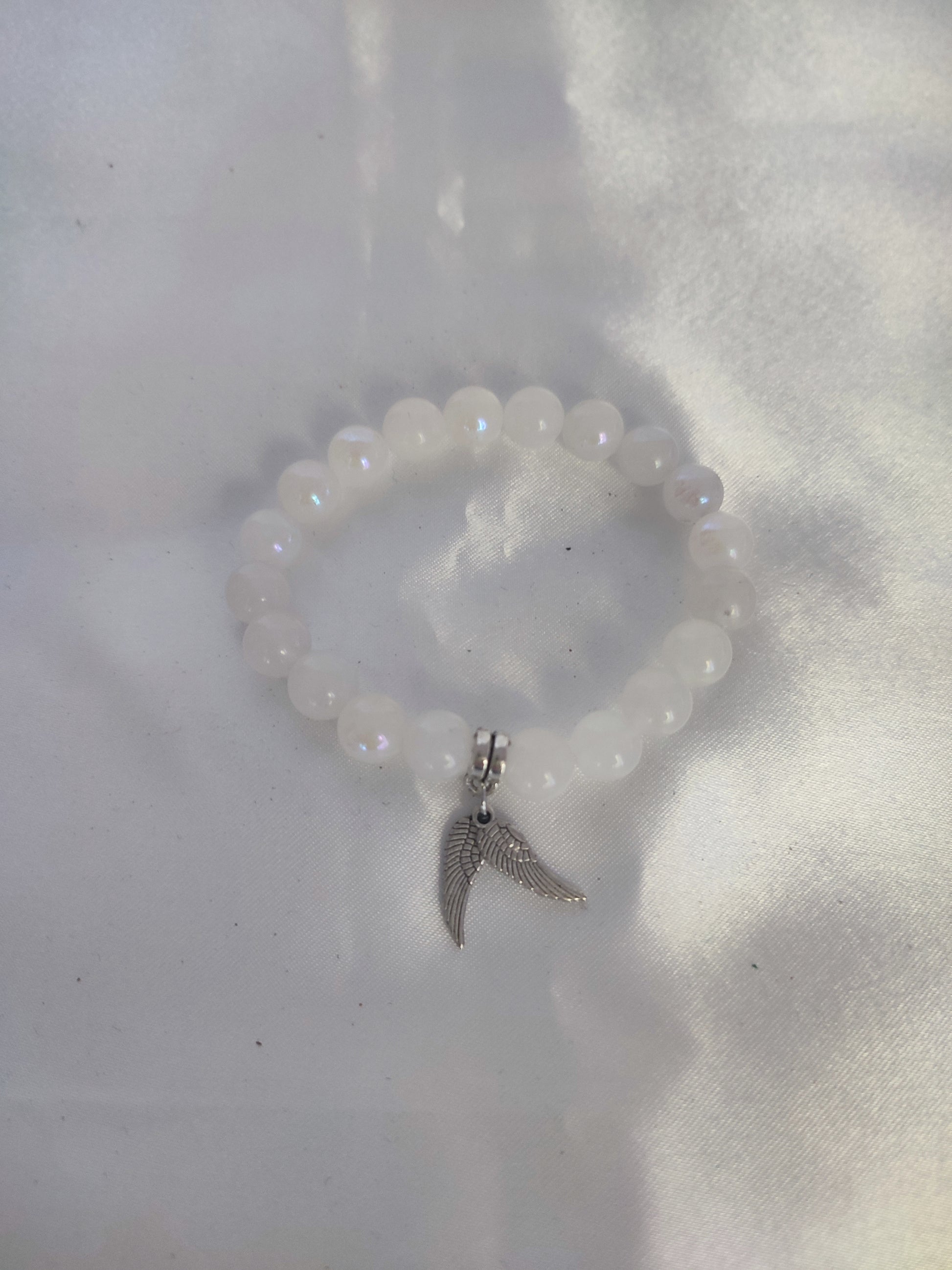 Conecte-se com a energia serena e iluminadora do Arcanjo Gabriel, mensageiro divino e guia da intuição. Esta pulseira feita com Moonstone Branca (Pedra da Lua) desperta a sensibilidade espiritual, fortalece a conexão com a intuição e promove paz interior.