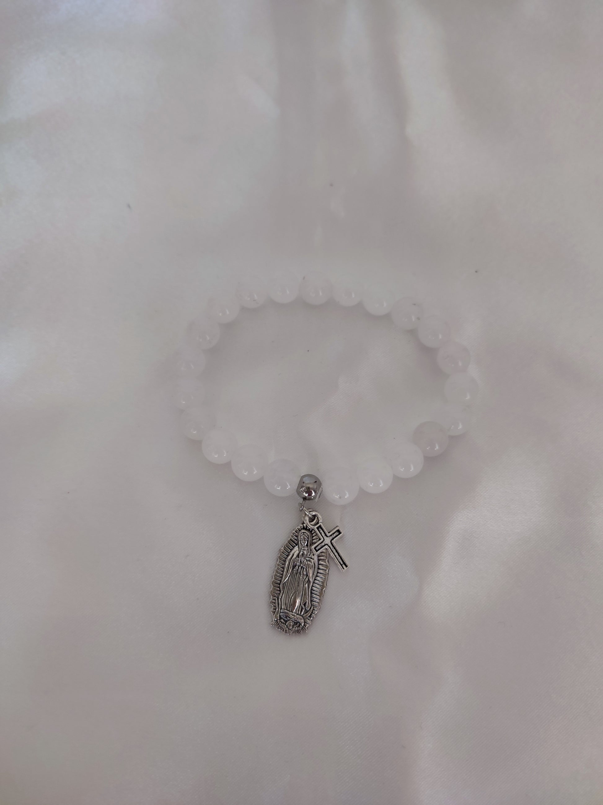 Uma peça que une a pureza e a energia do quartzo cristal, conhecido por promover clareza mental, equilíbrio e proteção, com a devoção e a fé representadas pela medalha da Nossa Senhora de Fátima.