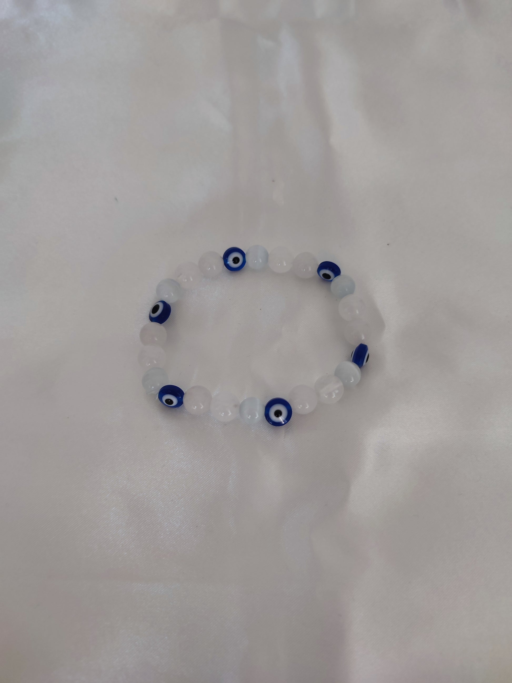 A pulseira com olho turco, selenita, jade branco e quartzo cristal.