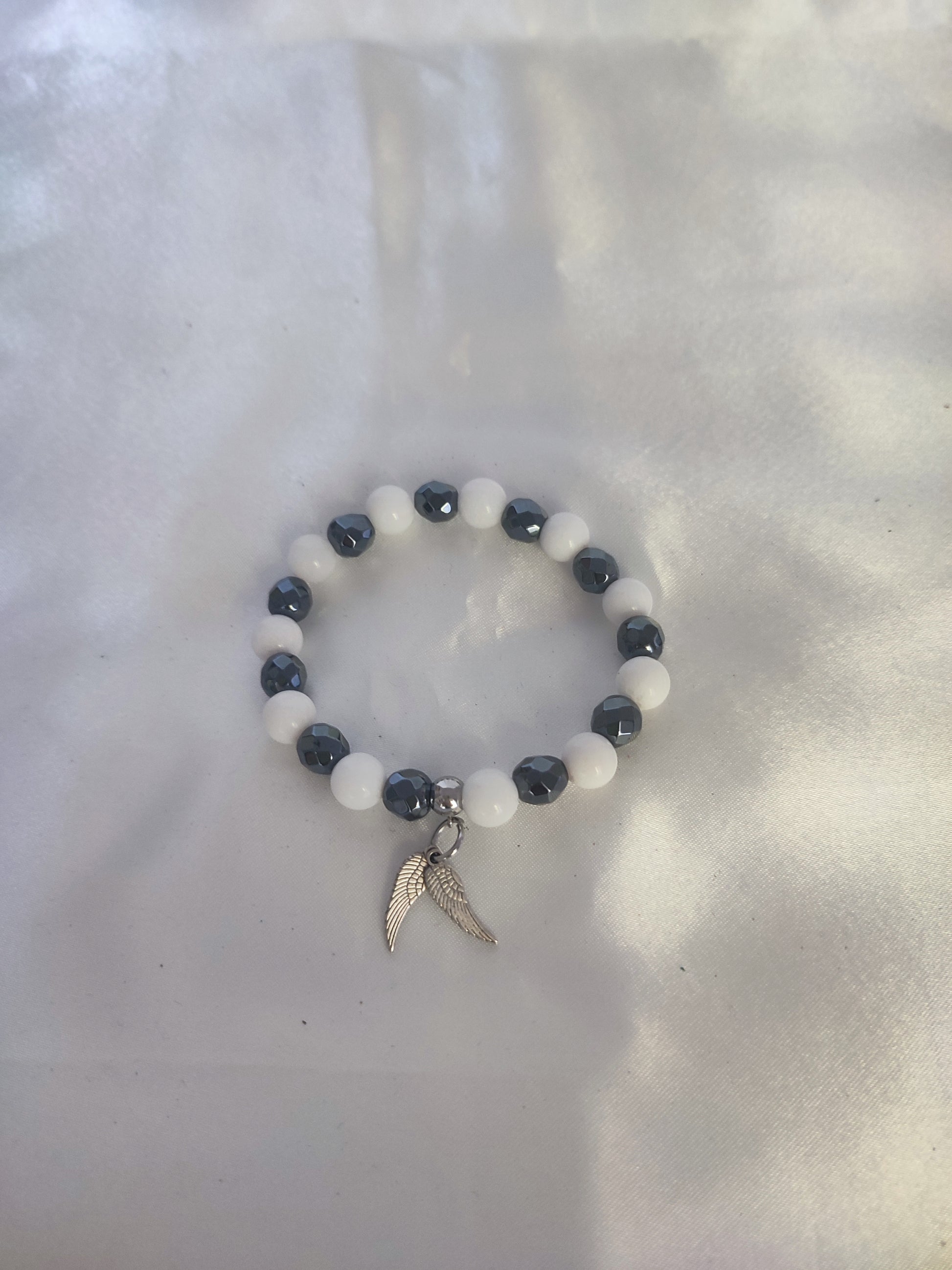 Sinta-se envolvida(o) pela presença amorosa e protetora do seu Anjo da Guarda com esta pulseira feita em Jade Malásia Branca e Hematite facetada. Uma combinação poderosa de suavidade e proteção energética, ideal para momentos de reflexão, oração ou para o dia a dia.