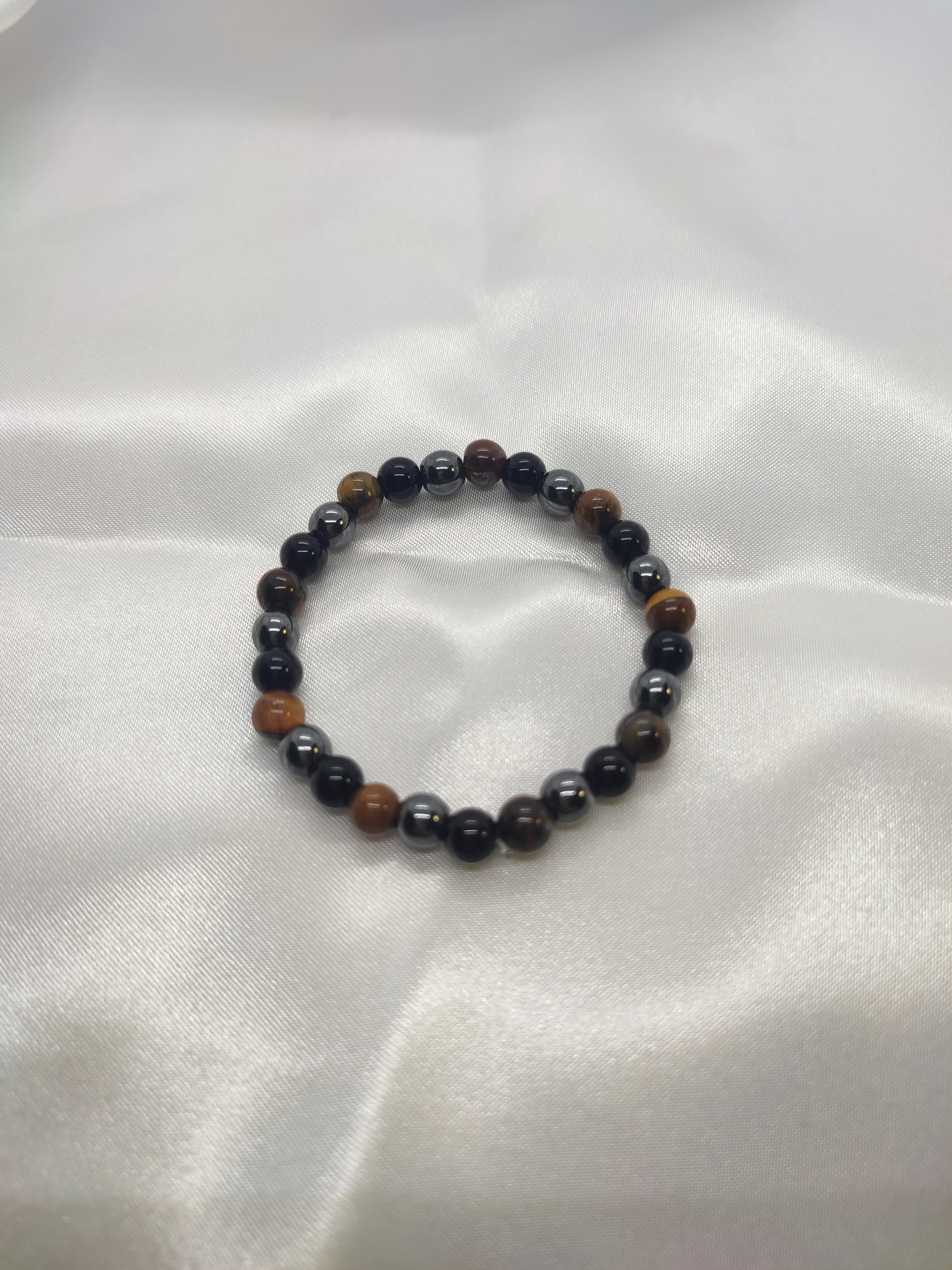 Uma poderosa combinação de turmalina negra, olho de tigre e hematite para proteção, coragem e equilíbrio energético. A turmalina negra age como um escudo contra negatividade, o olho de tigre inspira força e confiança, e a hematite promove foco e estabilidade.